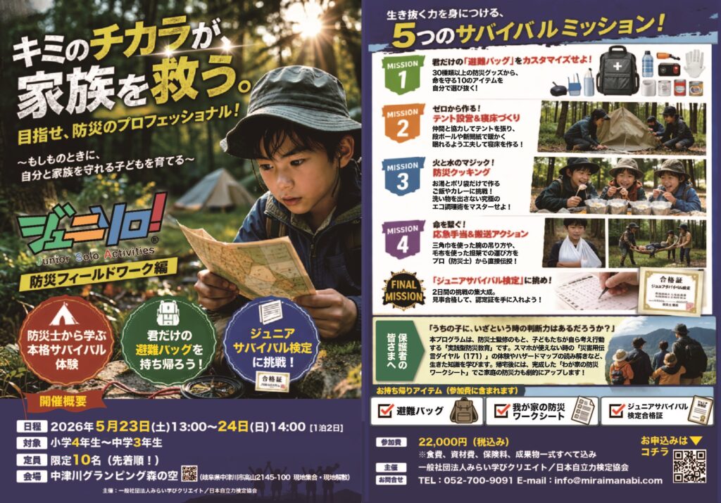 ・日本自立力検定協会(https://jiritsuryoku.jp/)の「ジュニアサバイバル検定」が取得できる!