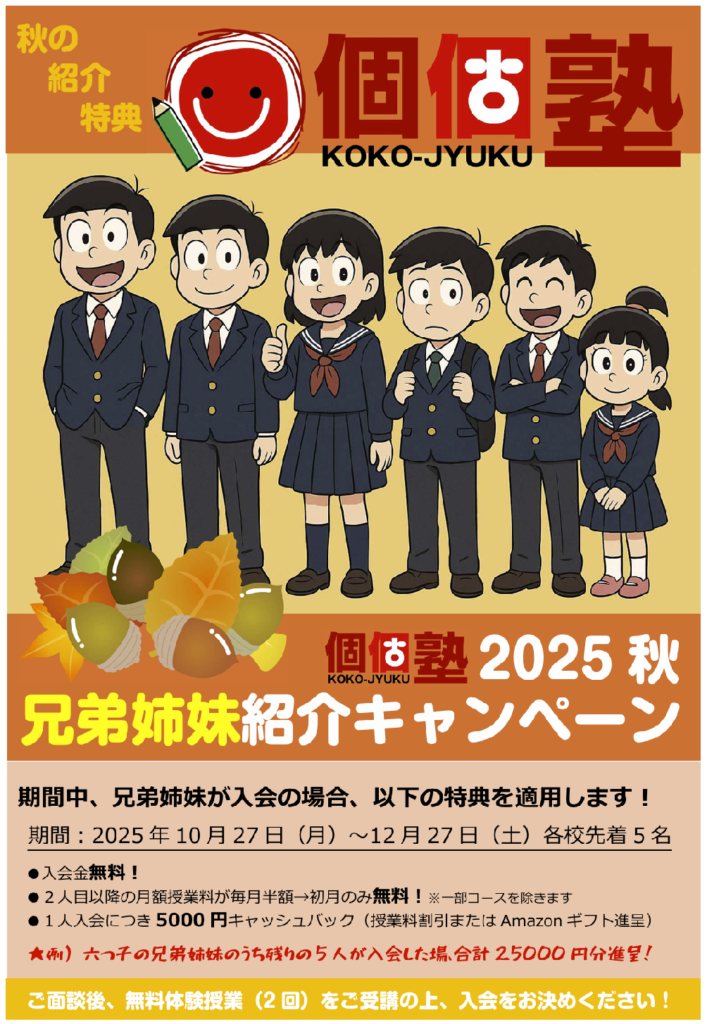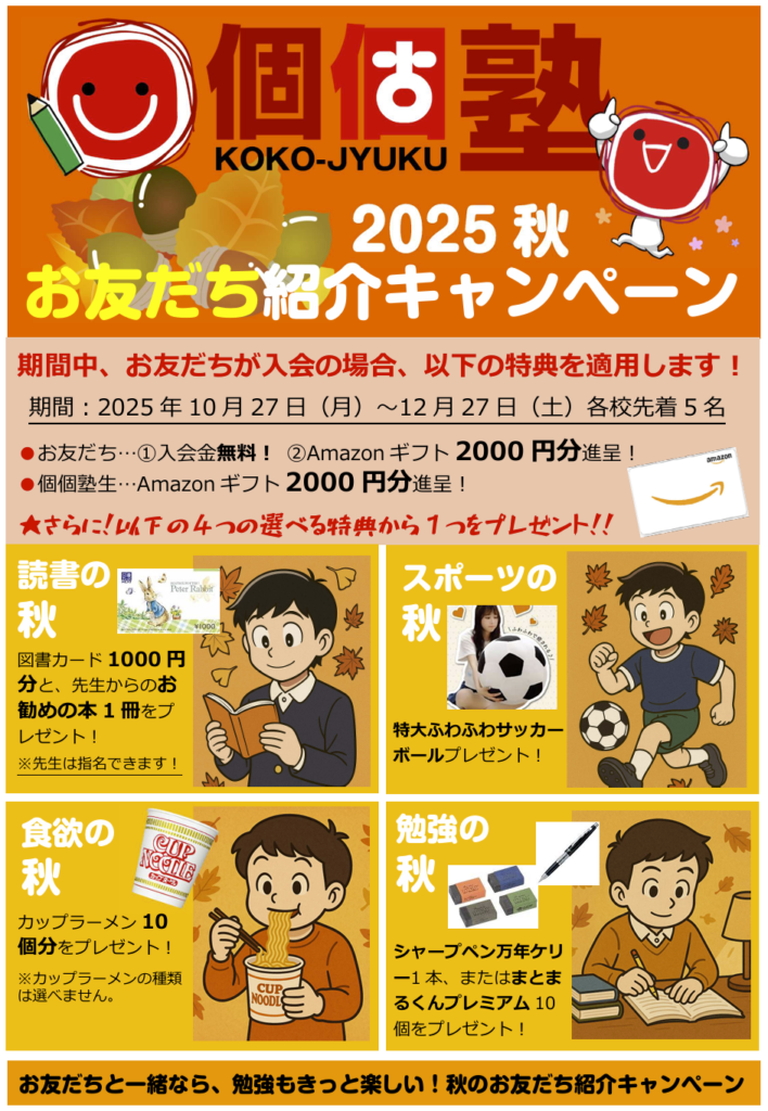 投稿日: 27/10/202528/10/2025 投稿者: 個個塾なごや塾長 お知らせ キャンペーン2学期応援!秋の紹介キャンペーン実施中! 個個塾なごや・にっしん・とうごう各教室では、現在秋だけの特別な紹介キャンペーン実施中!特にご兄弟姉妹のみなさんにはお得な内容になっておりますので、ぜひ一度お問合せください!